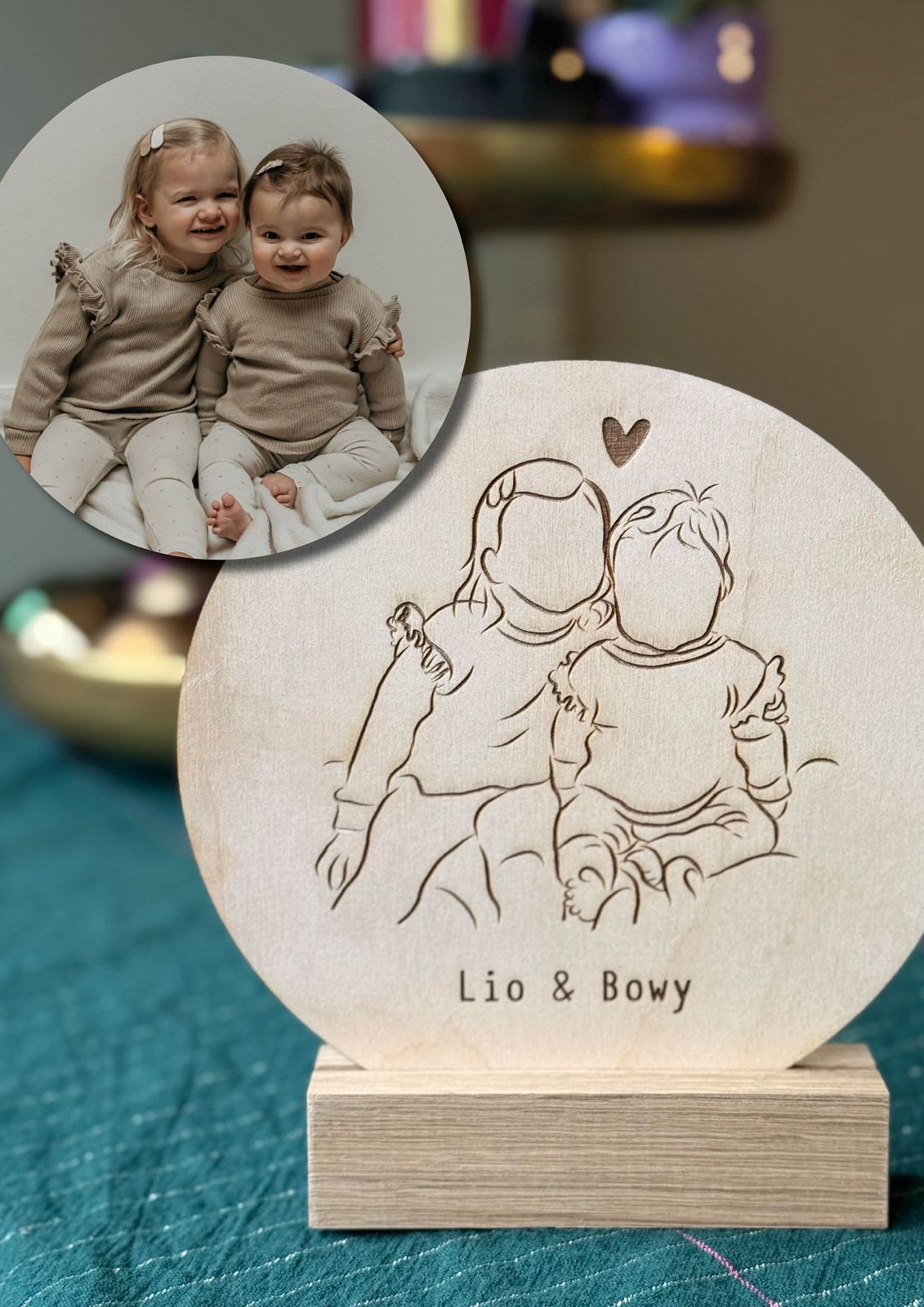 Onze stijlvolle houten cirkels worden nóg mooier met een unieke lijntekening! Denk aan een elegante illustratie van je gezin, een dierbare herinnering of een minimalistisch design dat perfect past bij jouw interieur. Met zijn zachte, ronde vorm en moderne uitstraling is deze houten cirkel een echte eyecatcher.